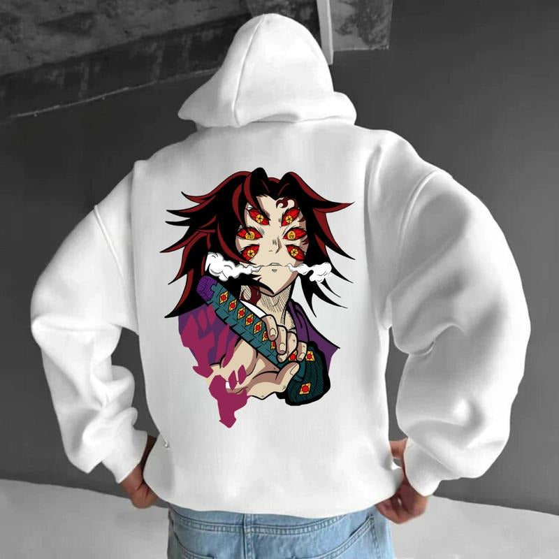 Upper Moons 2 Side Hoodie - Kokushibo Demon Style, Graphic Anime Design, White, Cotton Blend, Suitable for Casual Wear