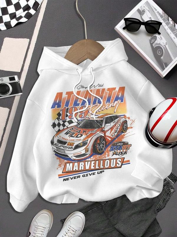Women's Race Car & Letter Print Hoodie, Casual Graphic Hooded Sweatshirt for Daily Holiday Outdoor Wear, Ladies Clothes for Spring & Fall