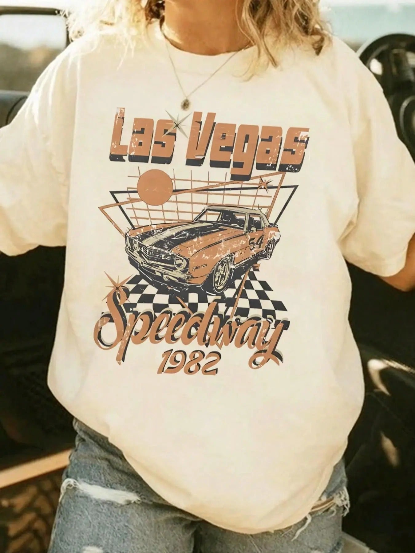Women's Vintage Car & Letter Print Drop Shoulder Tee, Casual Half Sleeve Round Neck Graphic T-Shirt for Summer, Fashion Women's Top for Daily Wear